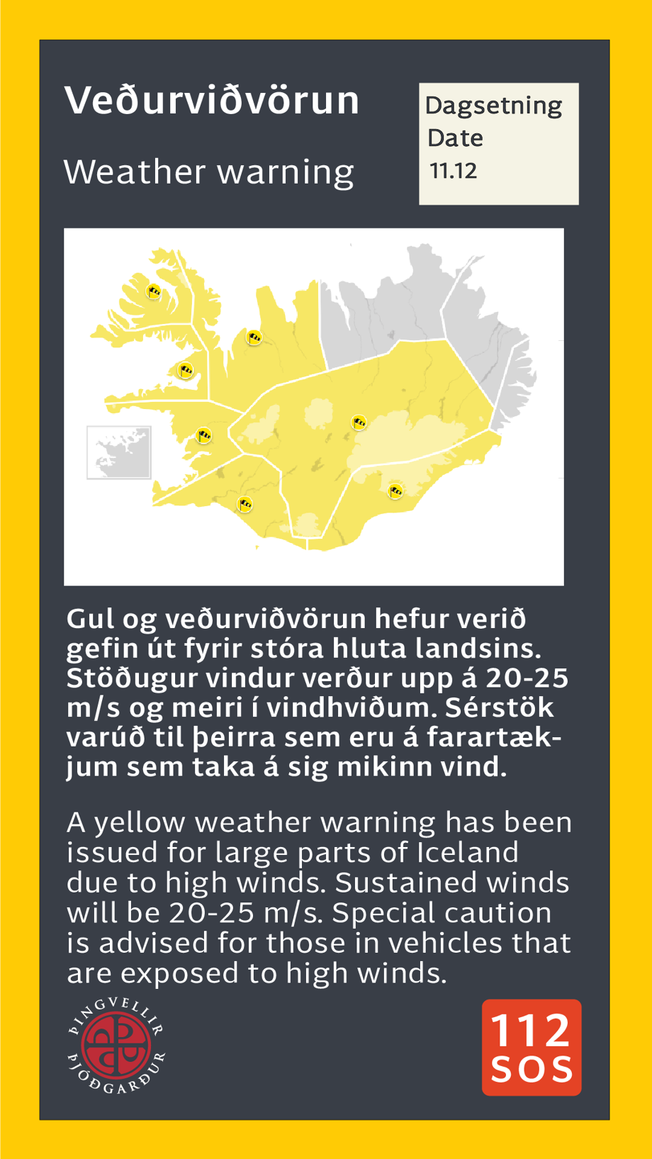 A yellow weather warning has been issued for large parts of the country due to high winds. Sustained winds will be 20-25 m/s and higher in gusts. Special caution is advised for those in vehicles that are exposed to high winds.