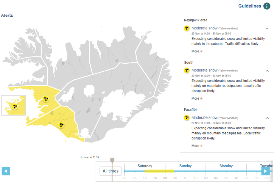 Yellow weather warning has been issued by the Icelandic Met Office for the southwest corner of Iceland. This is mostly due to some amount of snow might fall in the next 12 hours with some affect on road condition when driving to and from Þingvellir.