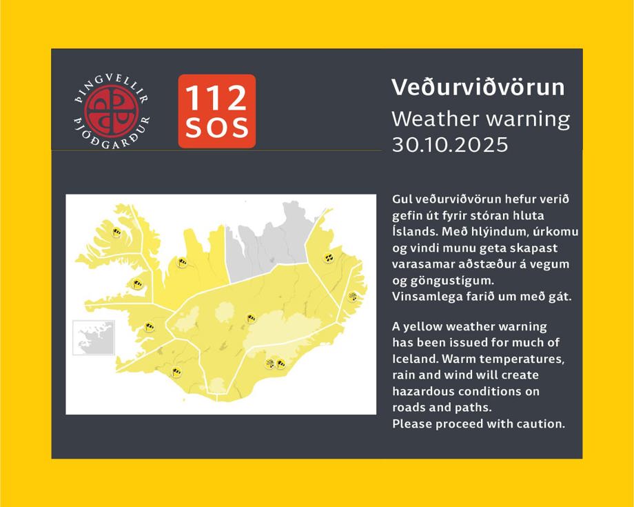 A yellow weather warning has been issued for much of Iceland. Warm temperatures, precipitation and wind will create hazardous conditions on roads and footpaths. Please proceed with caution.