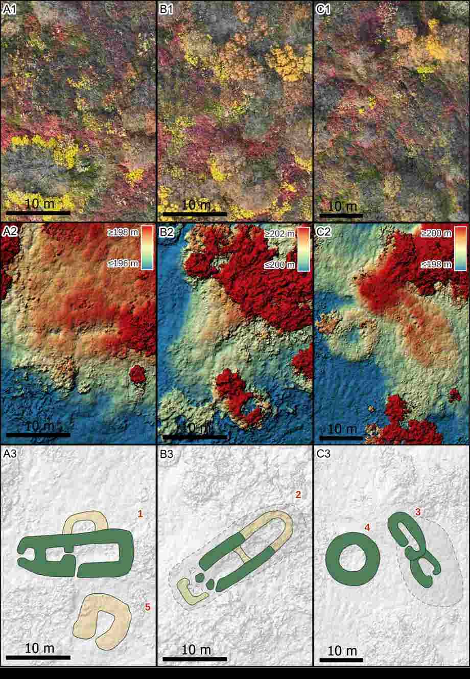 Litla-Hrauntún (samanburður): Litla-Hrauntún. Nærmyndir af vestari (A), eystri (B) og nyrðri (C) minjastöðum. Efst er samsett loftmynd (1), þá litað hæðarlíkan (2) og svo myndgreining (3).