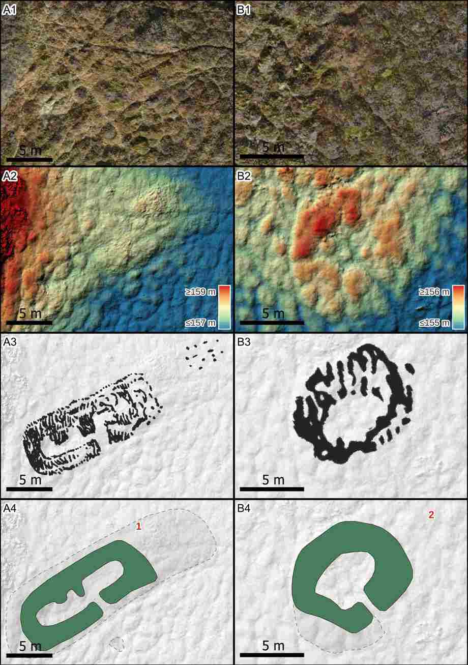 Grímastaðir (samanburður): Grímsstaðir. Nærmyndir af bæjarrúst (A) og ferhyrndri tóft (B). Efst er samsett loftmynd (1), þá litað hæðarlíkan (2), uppdráttur Brynjúlfs Jónssonar fornfræðings frá 1904 (3) og myndgreining höfundar (4).