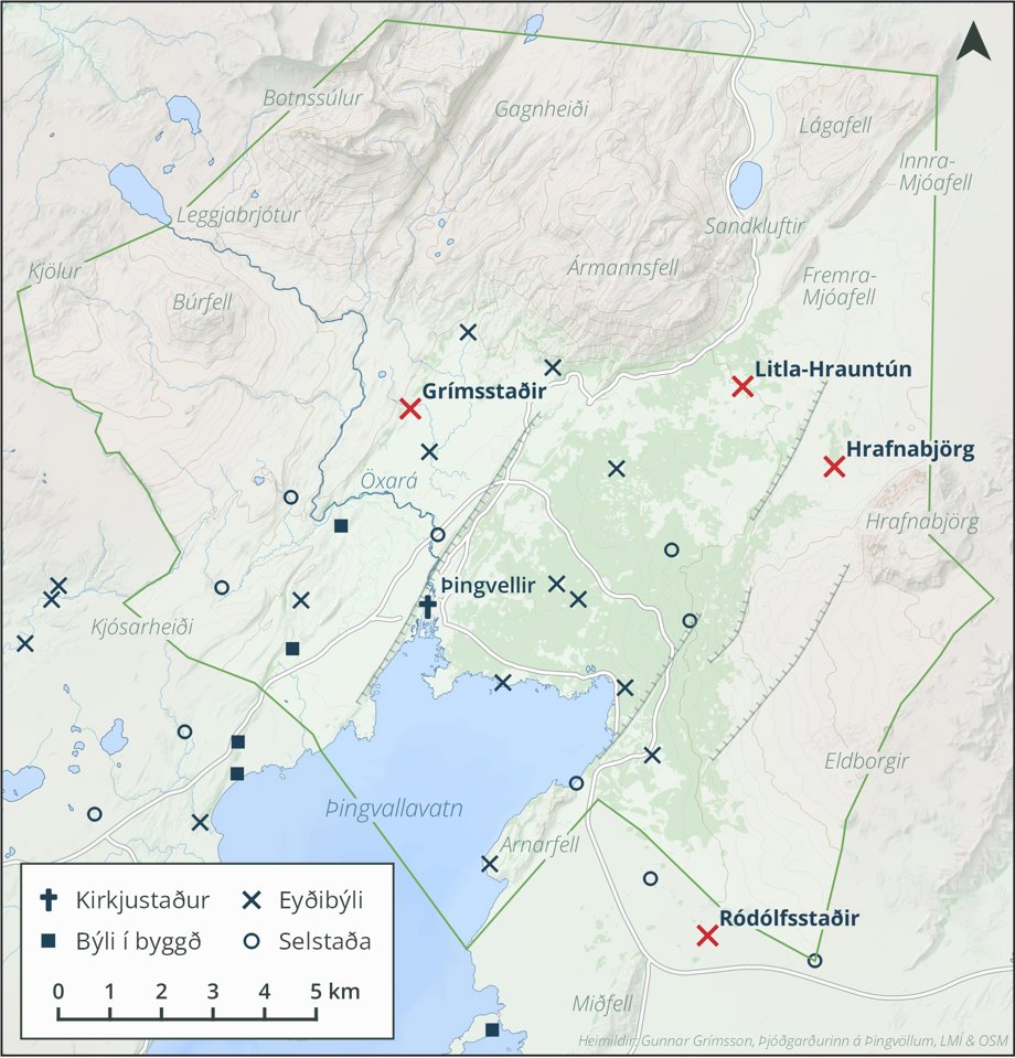 Byggðaleifar í Þingvallasveit í og við þjóðgarðinn á Þingvöllum, ásamt stöðunum sem fjallað er um í greininni.