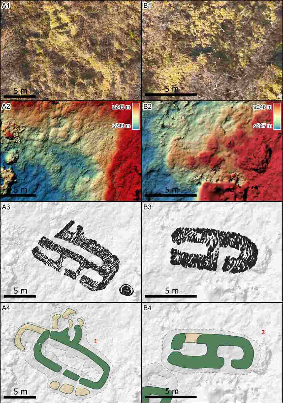 Nærmyndir af bæjarrústinni (A) og tvískiptri tóft (B). Efst er samsett loftmynd (1), þá litað hæðarlíkan (2), uppdráttur Brynjúlfs Jónssonar fornfræðings frá 1904 (3) og myndgreining höfundar (4).
