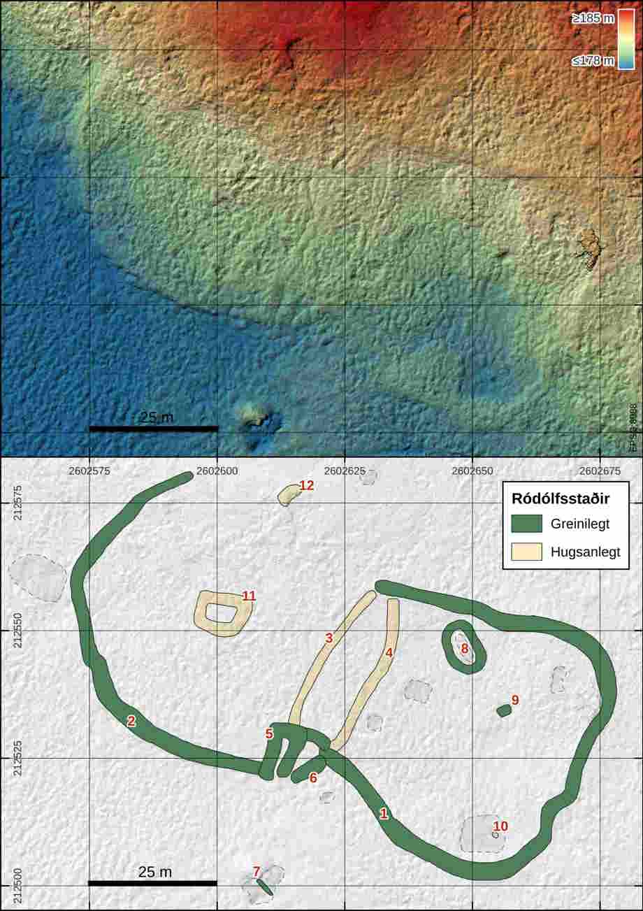 Nærmynd af garðlagi og mannvirkjaleifum. Efri myndin sýnir litað hæðarlíkan og sú neðri sýnir niðurstöður myndgreiningar.