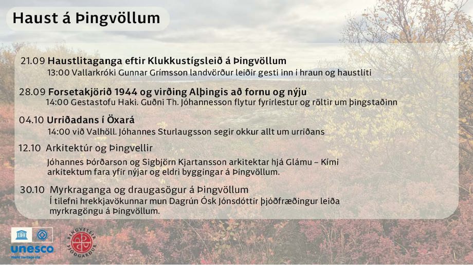 Fátt jafnast á við litadýrðina í þjóðgarðinum á Þingvöllum er haustið ber að garði. Af því tilefni verður efnt til sérstakrar haustlitagöngu inn í Þingvallahraun sunnudaginn 21. september 2025 klukkan 13:00 frá Vallarkróki.
