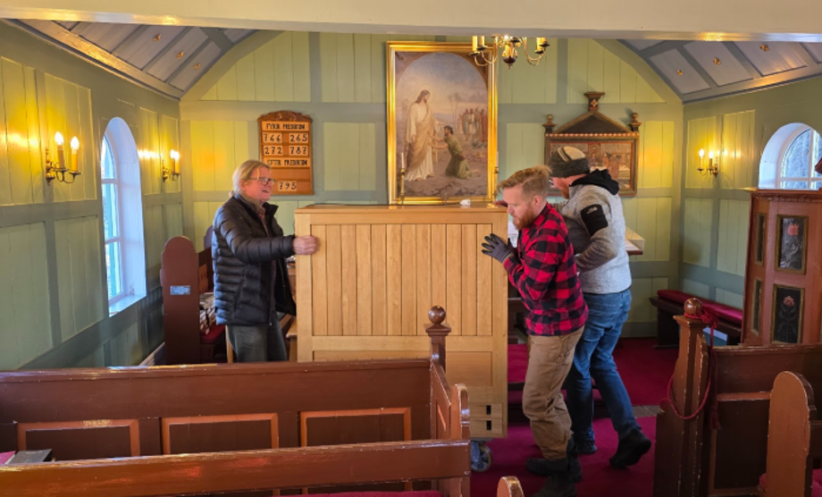 Degi áður en nýja orgelið barst var gamla orgelið borið út. Tækifærið var svo nýtt til að þrífa kirkjuna svo nýtt orgel fengi að njóta þess að vera sett á hreint gólf.