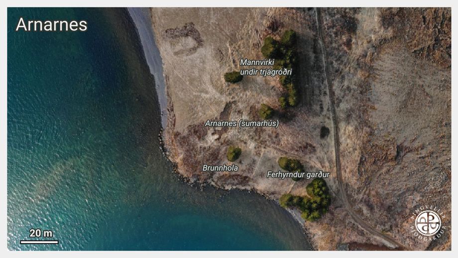 „Norðan við [Sláttulág] er ónefndur móbergsmúli. Norðvestan í múlanum stendur bærinn Arnarfell og túnkragi umhverfis. Þar myndast slakki upp í múlann. Á múlahorninu fremst er sumarbústaður byggður 1941 og gefinn Matthíasi Einarssyni lækni, sem þá var ábúandi jarðarinnar. Gefendur voru amerískir læknar, sem störfuðu með honum á Landakoti. Bústaðurinn heitir Arnarnes (11).“