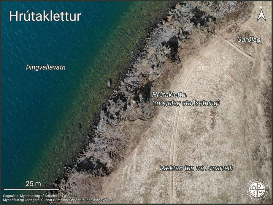 Samsett loftmynd af líklegri staðsetningu Hrútakletts frá apríl 2023.