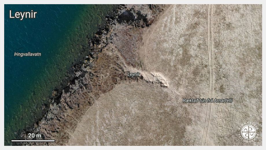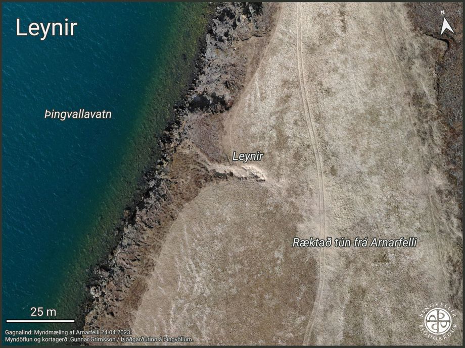 „Framan við [tún Arnarfellsbæjarins] í víkinni er malarkambur og ofan við hann er tjörn. Túnið upp af henni er brött brekka, og efst á brekkubrúninni er gamalt fjárhús og hlaða. Þar í norður myndast allbreiður slakki, sem nú er orðinn að túni. Norðan við þann slakka gengur lítil laut til norðvesturs og heitir Leynir (13) og liggur niður að standbergi 10–20 m háu.“