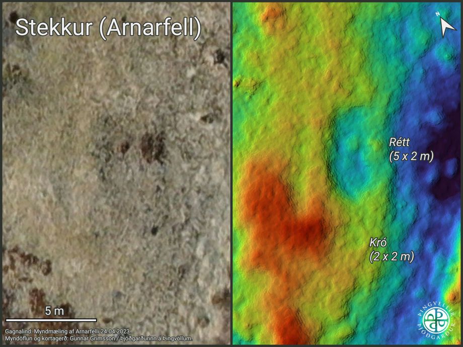 Samsett loftmynd og litað hæðalíkan af mögulegum stekki Arnarfells í Stekkjarlaut. Blátt táknar lægri hæð en rautt meiri hæð. Hér má greina útlínur mannvirkis.