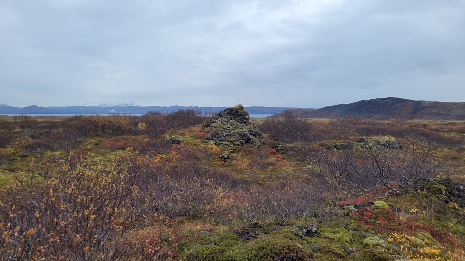 Horft til suðvesturs á Stórastein og járnstaurinn á kolli hans. Arnarfell hægra megin á myndinni.