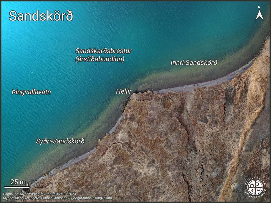 „Bergstallur fjallsins að norðvestan er hár, víða 15-20 m á hæð, beint niður í vatn. Þar sem hann endar að norðaustan er klettadrangur úti í vatninu, sem heitir Karl (19). Austan við hann eru tvær víkur, Syðri-Sandskörð (20) og Innri-Sandskörð (21). Þær eru greinilegar og slakkar upp af þeim. Milli þeirra er bergstallur eða skúti, sem fellur inn í, sem heitir Hellir (22).“