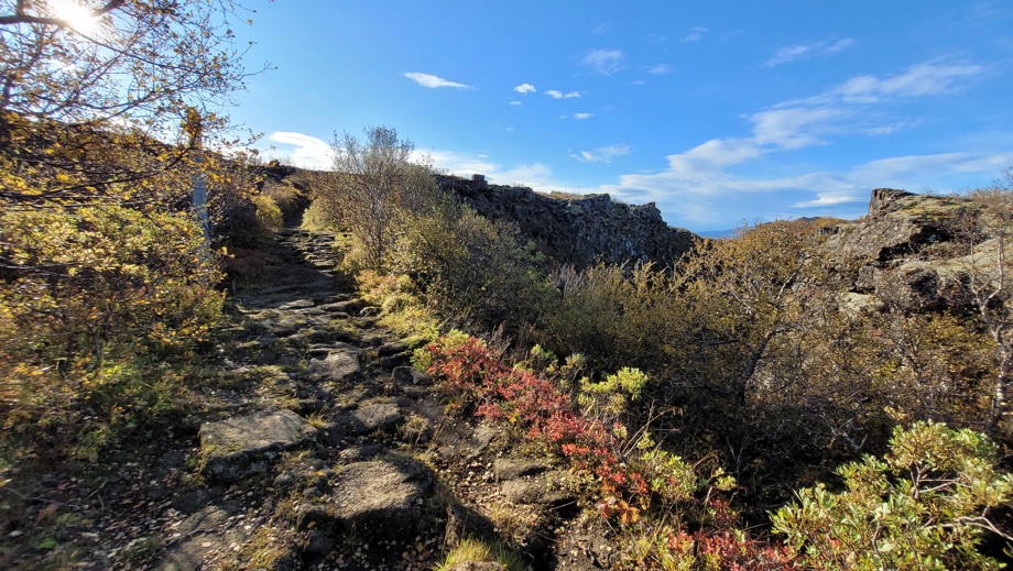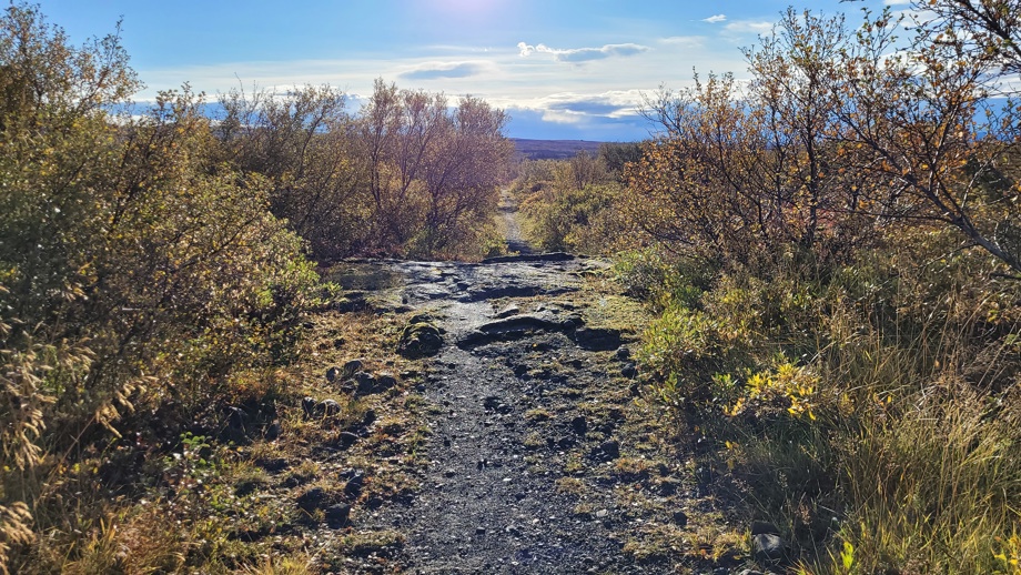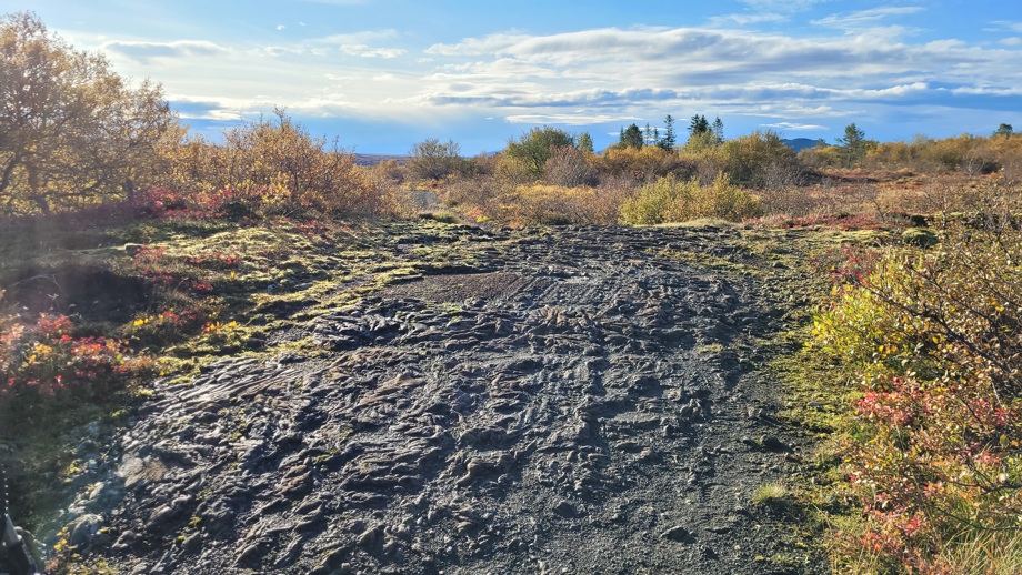 Gjábakkavegur liggur um Gjábakkastíg á Hrafnagjá. Flóruð stétt í forgrunni.