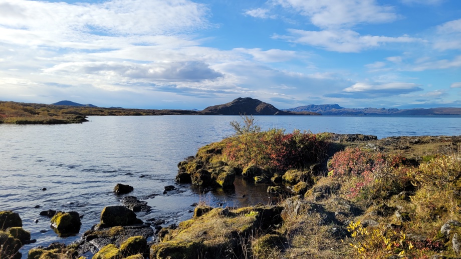Horft til suðurs yfir Vatnsvik að Arnarfelli. Ein af uppsprettulindunum við Vellankötlu í forgrunni.