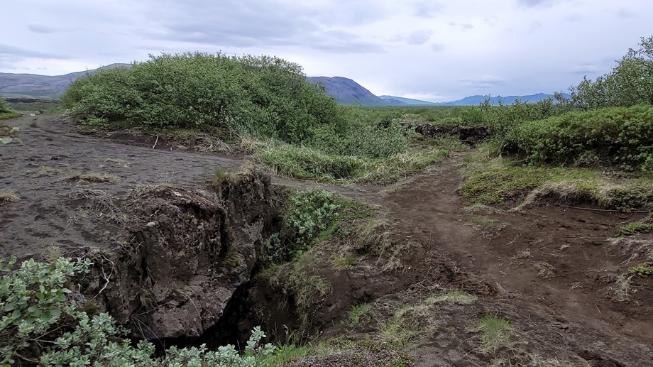 Farið yfir varasamar sprungur á Sandhólastíg. Ármannsfell og Skjaldbreiður í fjarska.