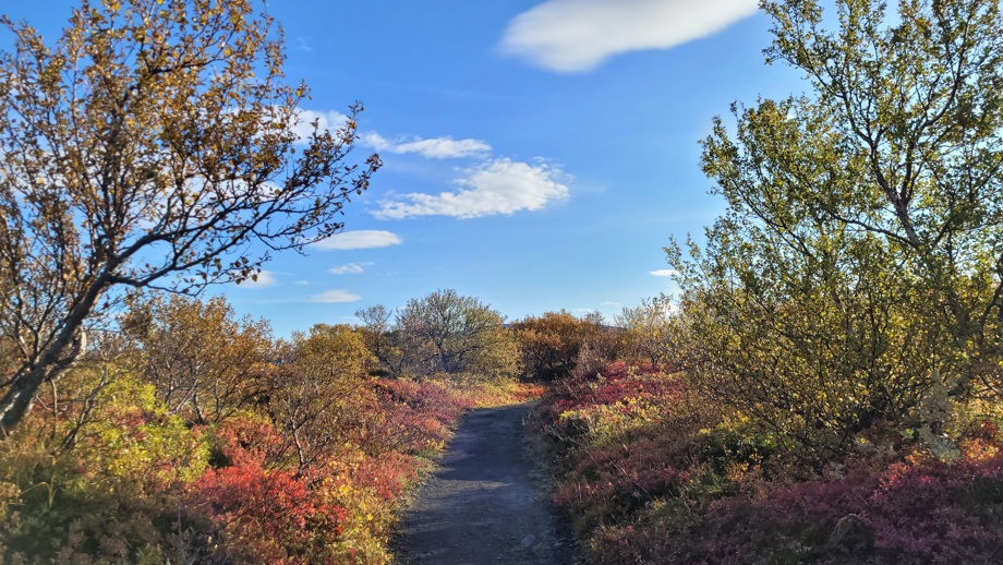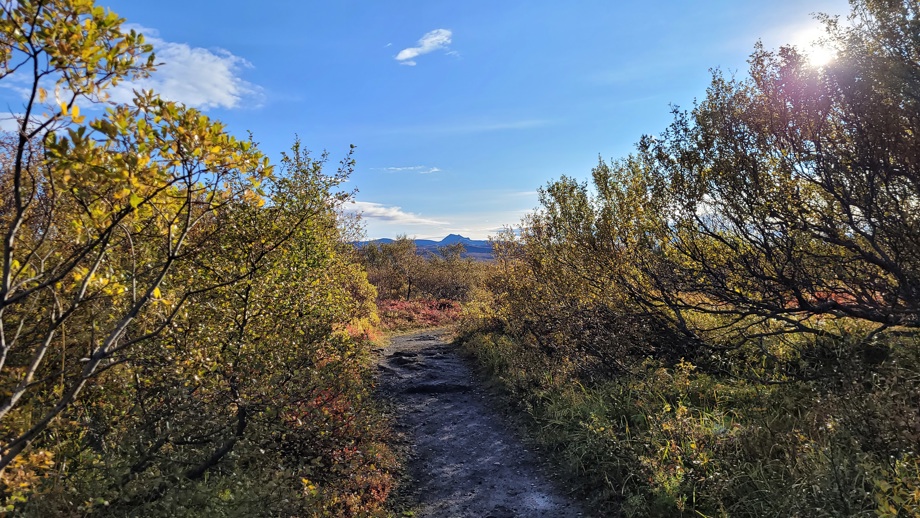 Gangan hefst hjá Efrivöllum í svonefndum Vallakróki, við vatnsfyllta gjá sem heitir Vallagjá og er framhald Flosagjár í norðri. Gengið er til suðausturs yfir Vallagjá um haft sem heitir Vallastígur og fljótlega er akvegurinn þveraður. Eftir nokkurra mínútna göngu um þétta kjarrbreiðu er komið að ónefndum stíg á Háugjá. Þar opnast gott fjallaútsýni til austurs. Frá Háugjá er farið yfir mosagróna eyðu og þaðan meðfram skógi vaxinni hólaþyrpingu sem kallast Skógarhólar.