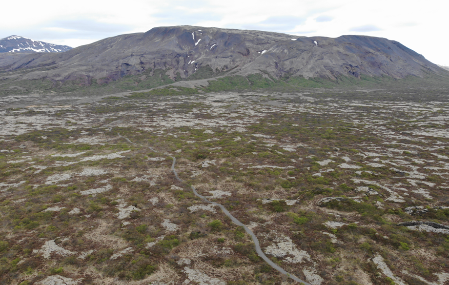 Horft til norðurs að Ármannsfelli frá slóðum Hrauntúns. Réttargata í forgrunni með stefnu á Sleðaás.