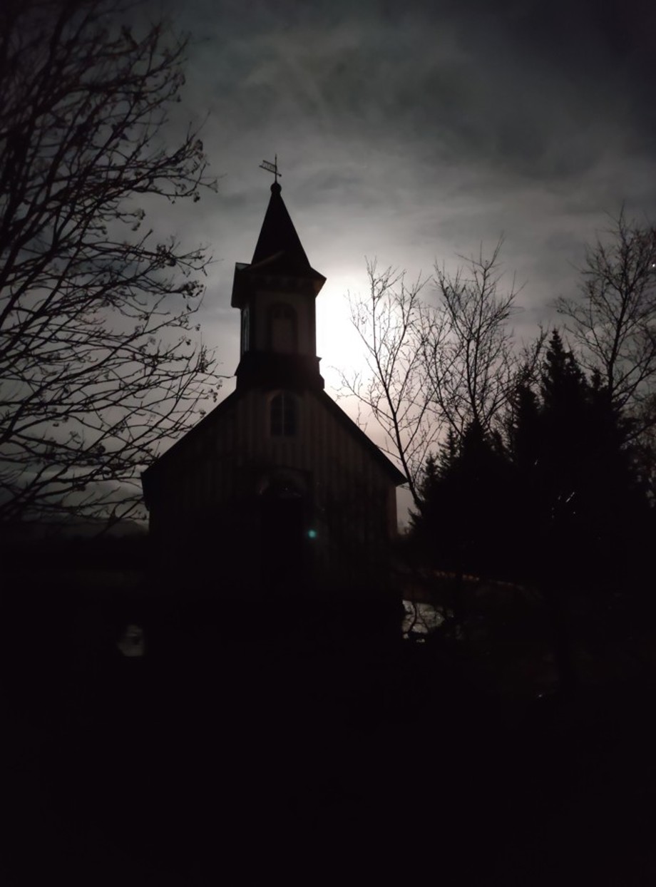 Við getum ekki lofað tungli bak við Þingvallakirkju en það verður dimmt.
